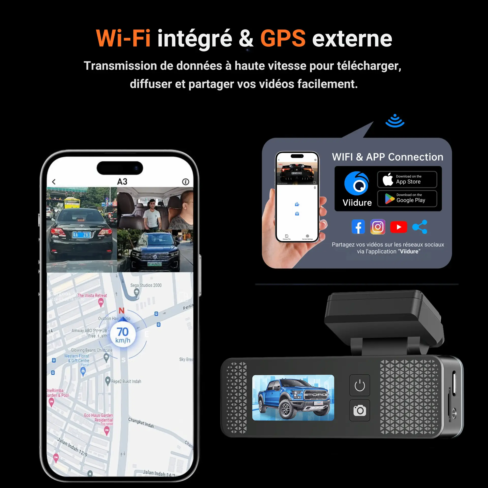 Activez le WiFi de la dashcam, connectez votre smartphone au réseau WiFi généré par la caméra, puis ouvrez l’application gratuite Viidure (iOS/Android). Vous pourrez consulter, télécharger ou partager vos vidéos en quelques secondes.