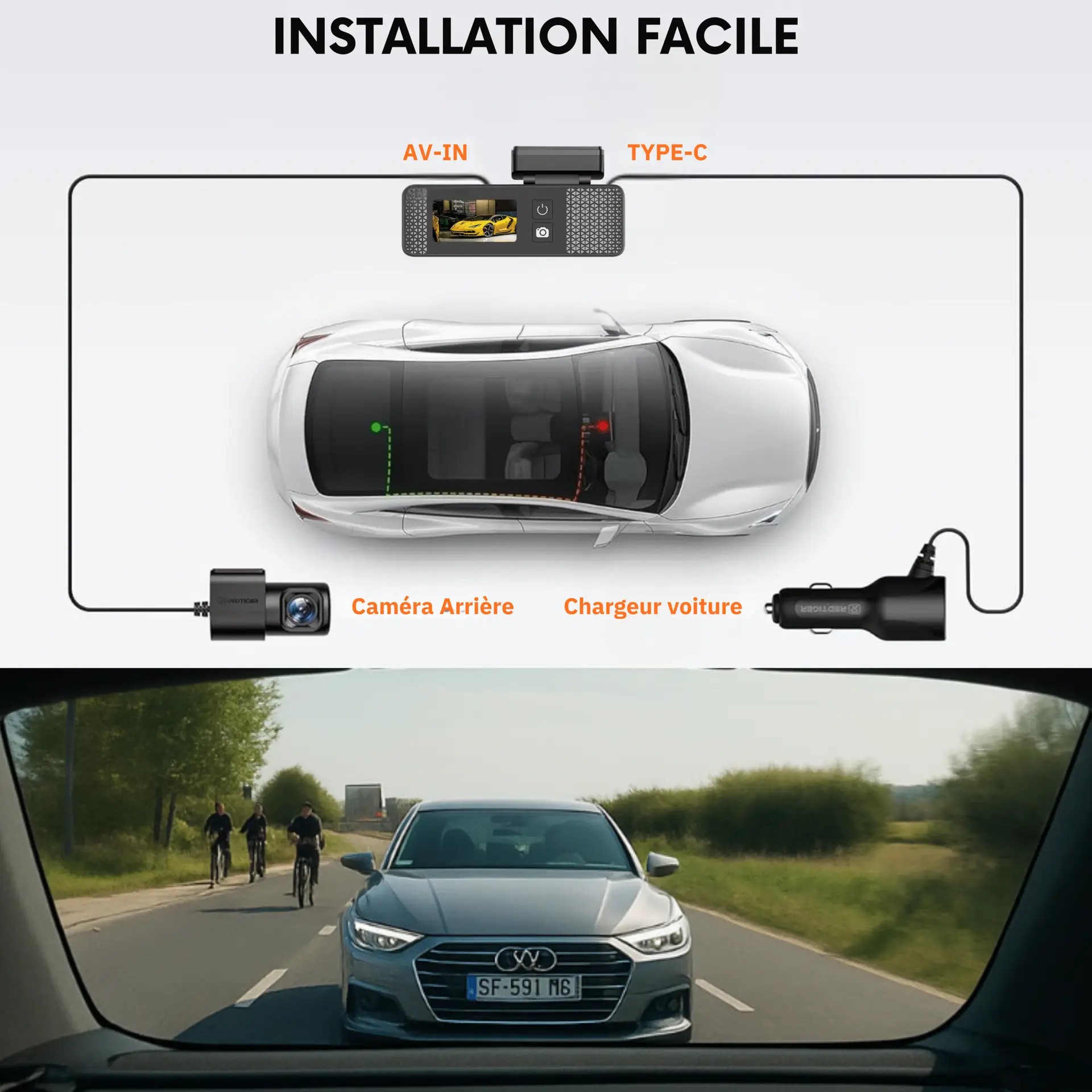 Oui. L’installation est simple et rapide : la caméra avant se fixe derrière le rétroviseur via un support adhésif, et la caméra arrière se colle à la vitre grâce au sticker fourni. Aucun outil particulier n’est nécessaire.