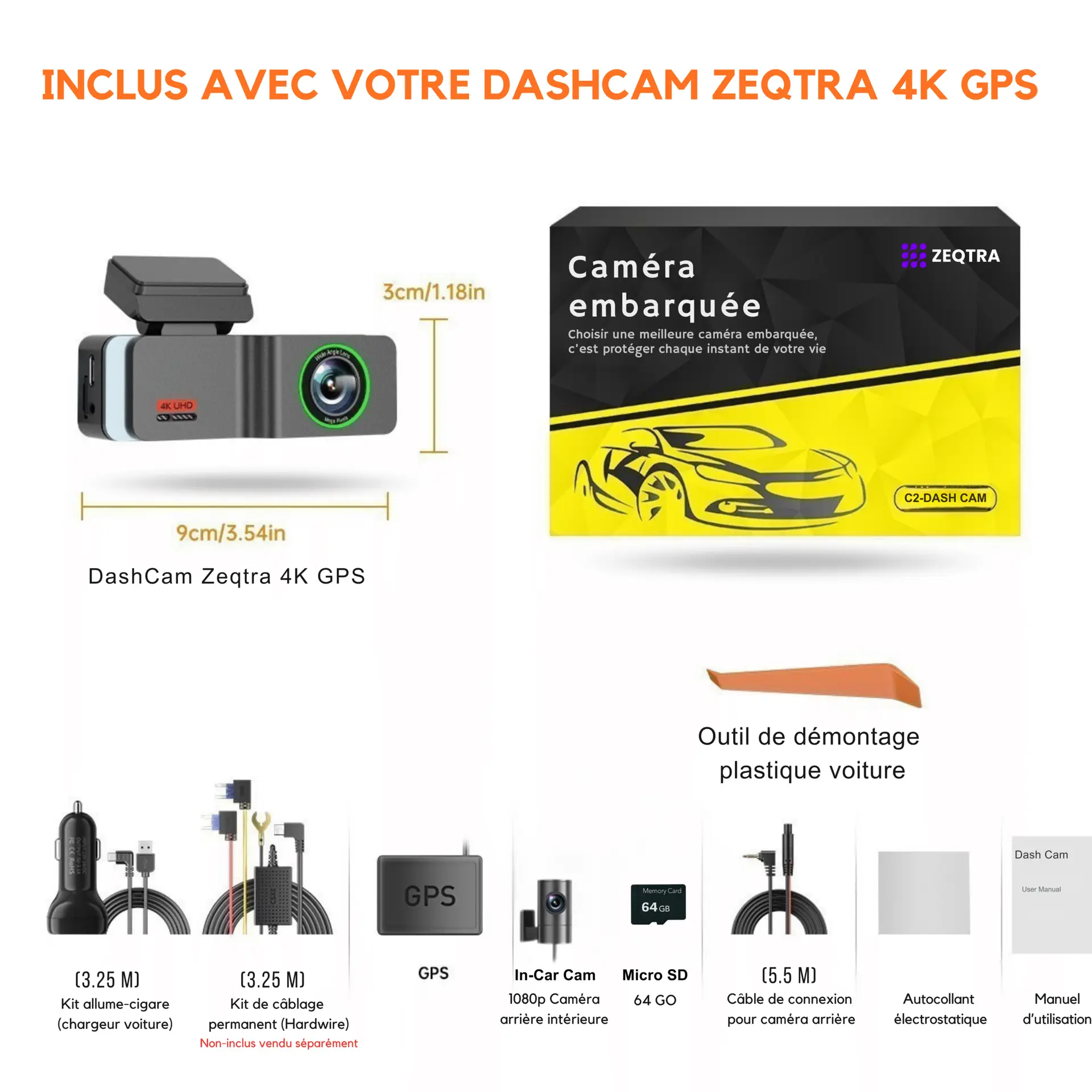 1 × Dashcam Zeqtra 4K GPS (caméra avant), 1 × Caméra arrière Full HD 1080P, 1 × Support détachable, 1 × Câble USB Type-C, 1 × Chargeur allume-cigare, 1 × Guide d’utilisation rapide