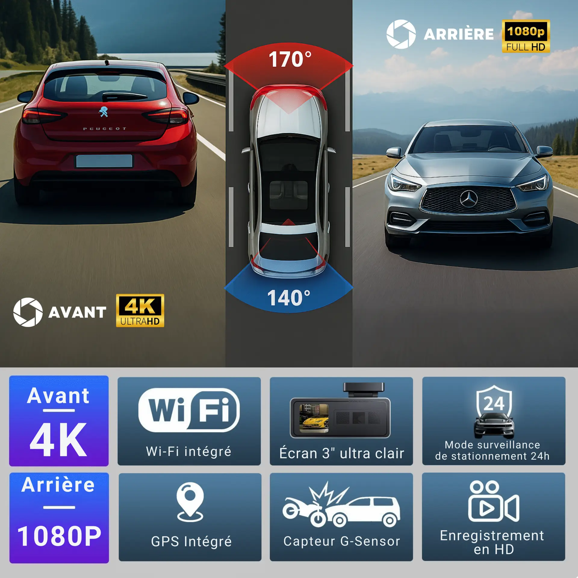 Résolution avant : 4K UHD 2160P/30fps. Résolution arrière : 1080P Full HD. Angles de vision : 170° avant et 140° arrière. Capteur : Sony Starvis avec WDR/HDR. GPS intégré et WiFi. Mode parking 24h et capteur G. Support microSD jusqu’à 256 Go. Format vidéo H.265. Batterie interne 5 mAh (sauvegarde fichiers d’urgence). Connexion USB Type-C.