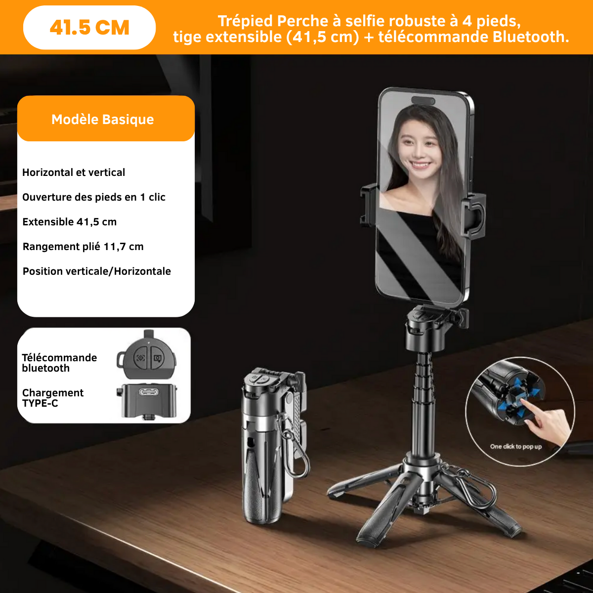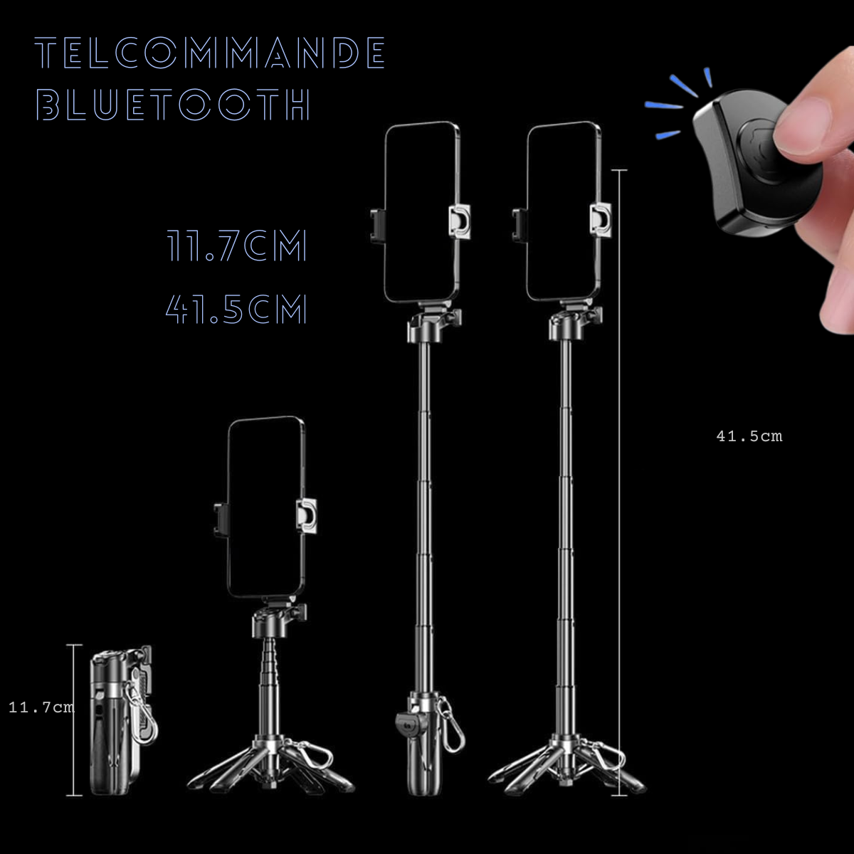 Perche/trépied extensible avec support standard, Télécommande Bluetooth intégrée, Câble de recharge USB (si applicable), Manuel d’utilisation rapide