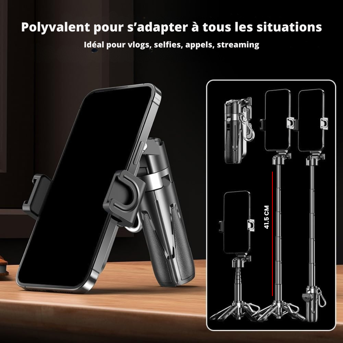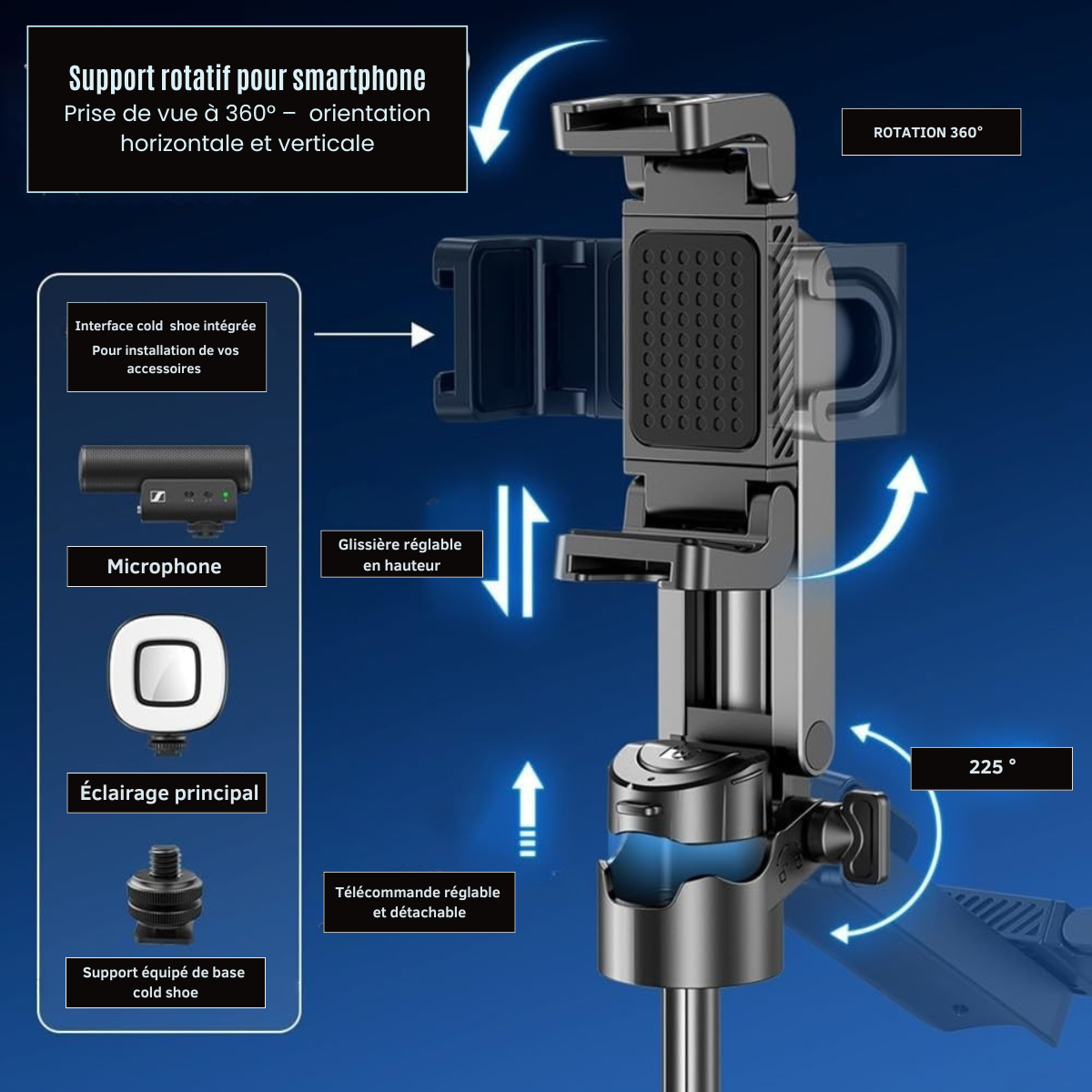 Le support rotatif permet un passage fluide entre mode portrait et paysage, ainsi que des angles dynamiques pour vos selfies, vlogs ou tutos.